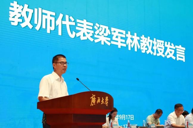 道路与桥梁工程系梁军林教授作为教师代表发言。他回顾自己年轻时求学西大的经历,深情地讲述自己辗转多年最终回归西大土木“大家庭”的人生经历,鼓励新生在工程行业内找到自己的定位,练就过硬的技术,掌握发言权。他同时概括了自己在科研理论上的新进展,并寄语新生,在学习,工作和生活中没有一帆风顺和平坦的道路,希望同学们努力学习,强健体魄,团结协作,勇攀高峰,在自己的人生上舞出精彩。