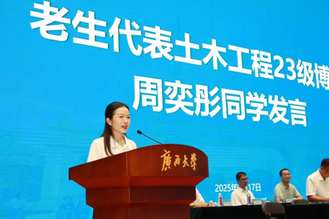 土木工程23级博士周奕彤同学作为老生代表进行分享。她化用动画电影《浪浪山小妖怪》的语句,分享自己在学院这片广阔知识天地中,从懵懂“小妖怪”蜕变为勇敢“追光者”的历程。她鼓励新生,以“啃透课本的执着”叩响专业之门,破茧而出;以“向下扎根的坚守”践行报国之志,躬身前行;以“突破自我的勇气”追逐不设限人生,攀登高峰。