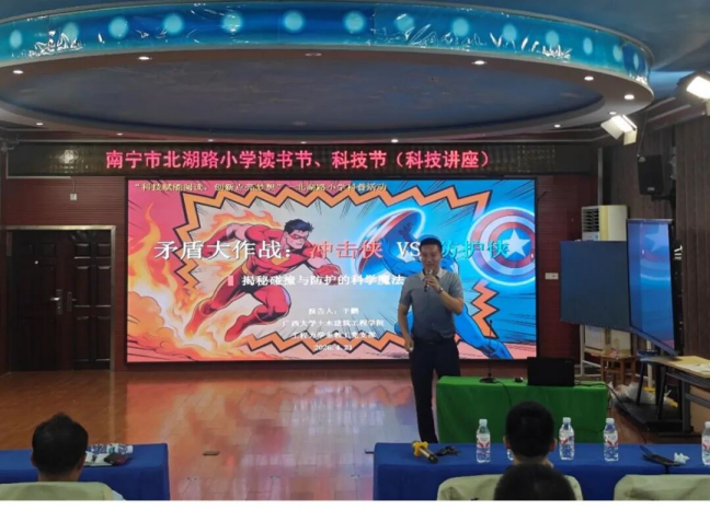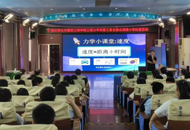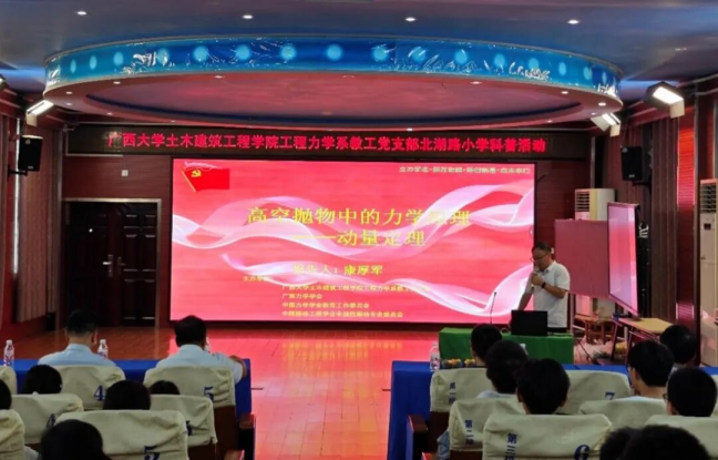 为深入学习贯彻党的教育方针,充分发挥高校教师党支部专业优势,推动党建与科普育人深度融合,2026年4月21日下午,我院工程力学系教工党支部走进南宁市北湖路小学,参加“科技赋能阅读,创新点亮梦想”读书节、科技节暨中国航天日活动,开展以《拒做“高空抛物者”,争当“航天追梦人”》为主题的科普讲座,为150余位五年级小朋友带来了一场内容丰富、生动有趣的科学课堂。