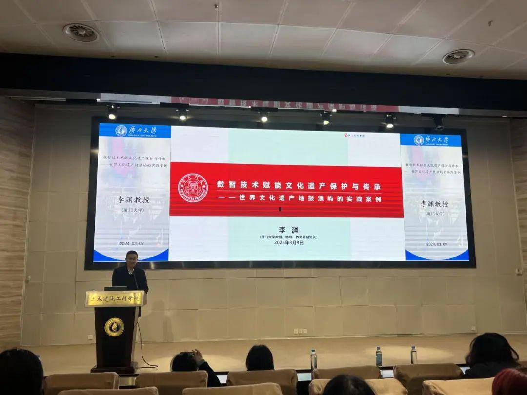 2024年3月9日下午,厦门大学建筑与土木工程学院李渊教授应邀到3044永利集团交流访问,并在新结构实验平台综合楼报告厅为我院师生作了题为《数智技术赋能文化遗产保护与传承——世界文化遗产鼓浪屿的实践案例》的学术报告。报告由建筑规划系主任李欣教授主持,参加报告的还有廖宇航、谢小英、吴杰、周游、梁林达、顾雪萍等教师,以及200多名学生共同聆听了此次报告。